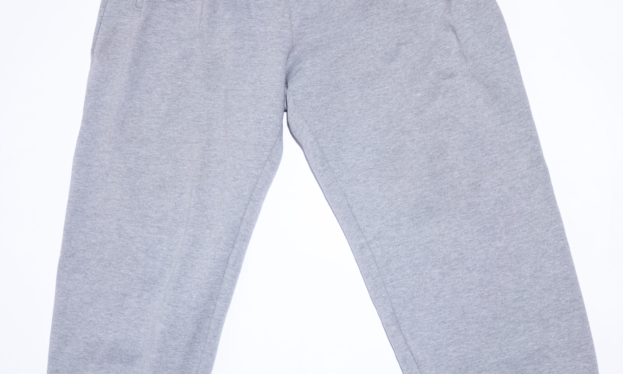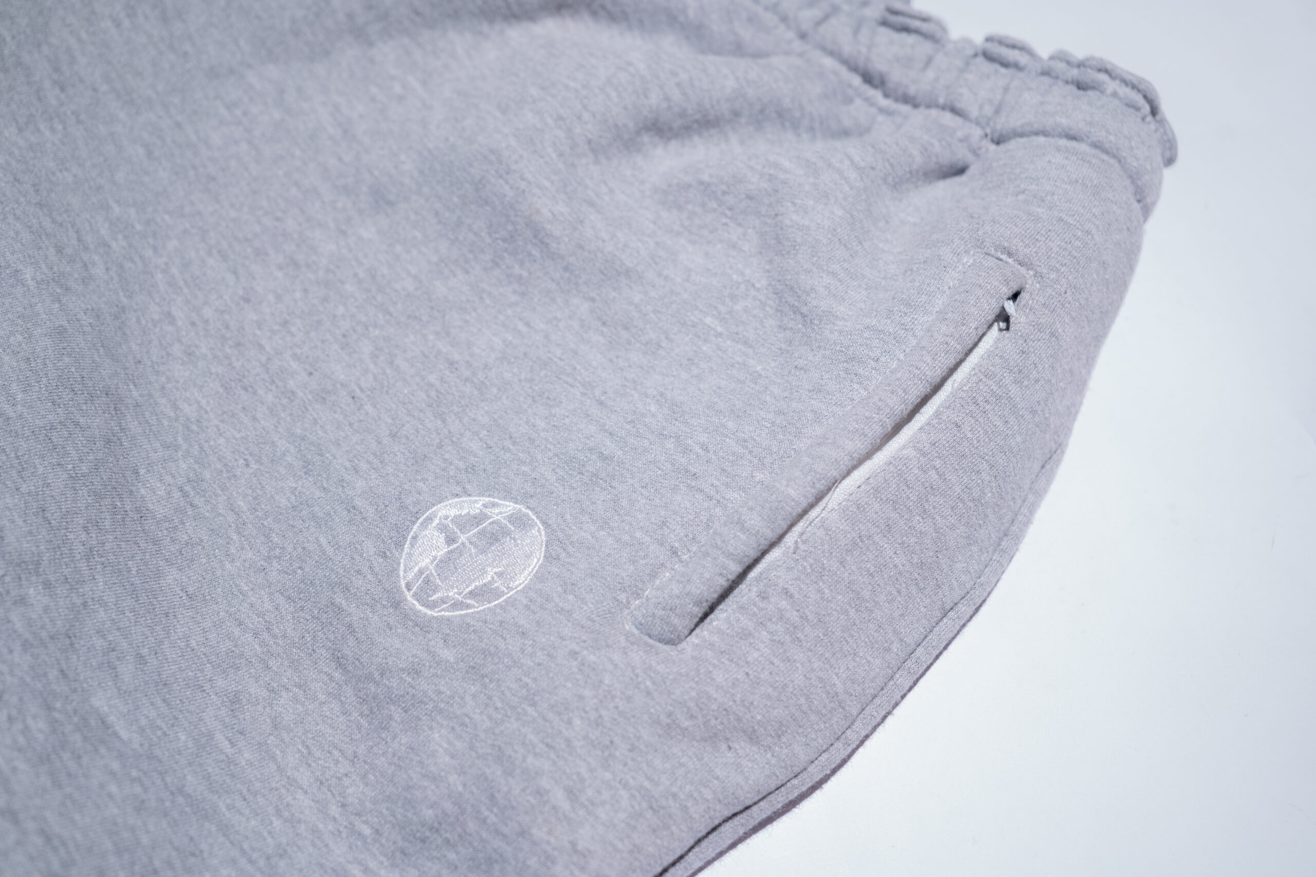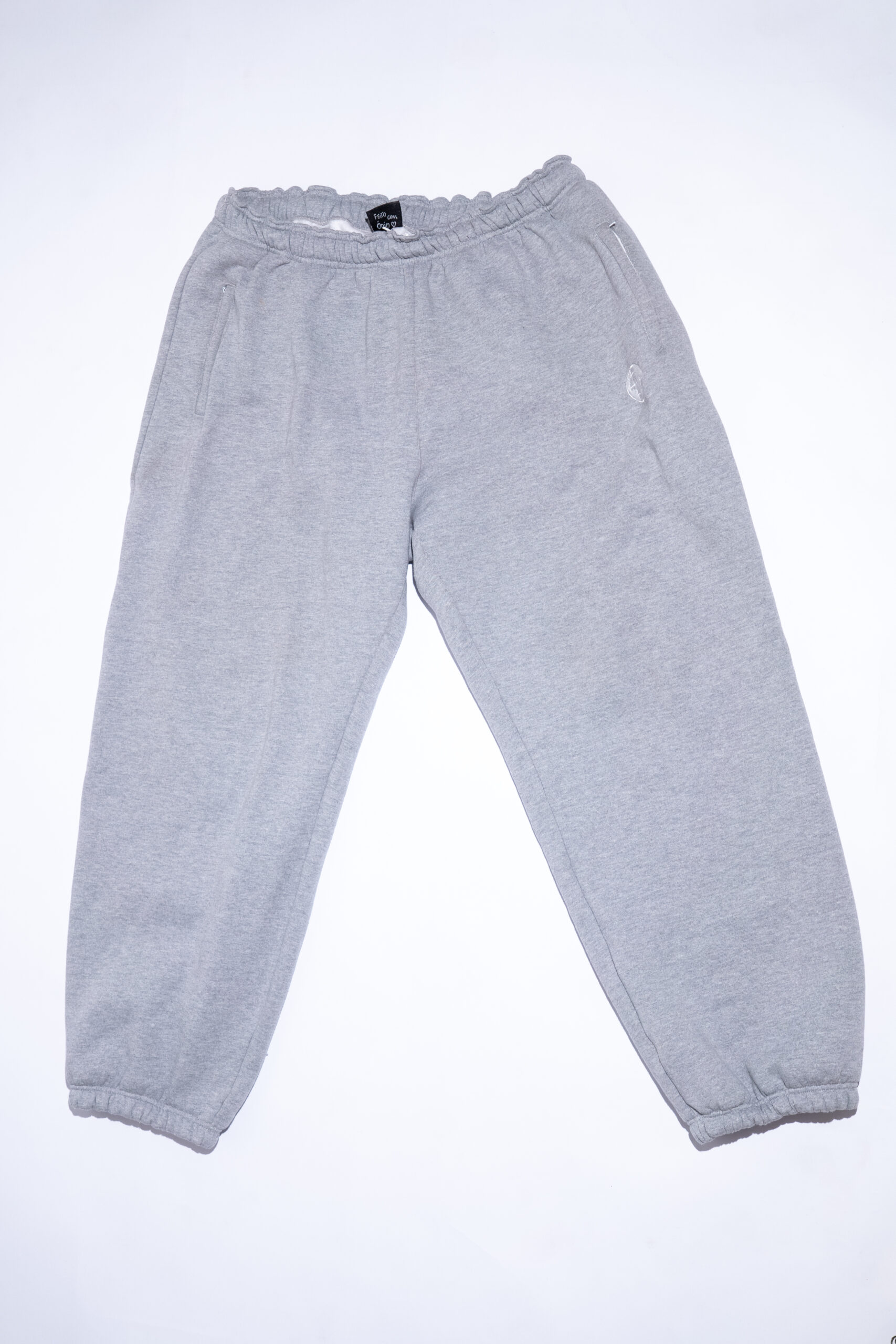 Calça de moletom cinza com bordado branco na lateral, cadarço na cintura para ajuste, bolsos com zíper na lateral e bolso aberto na parte de trá e elástico na barra.