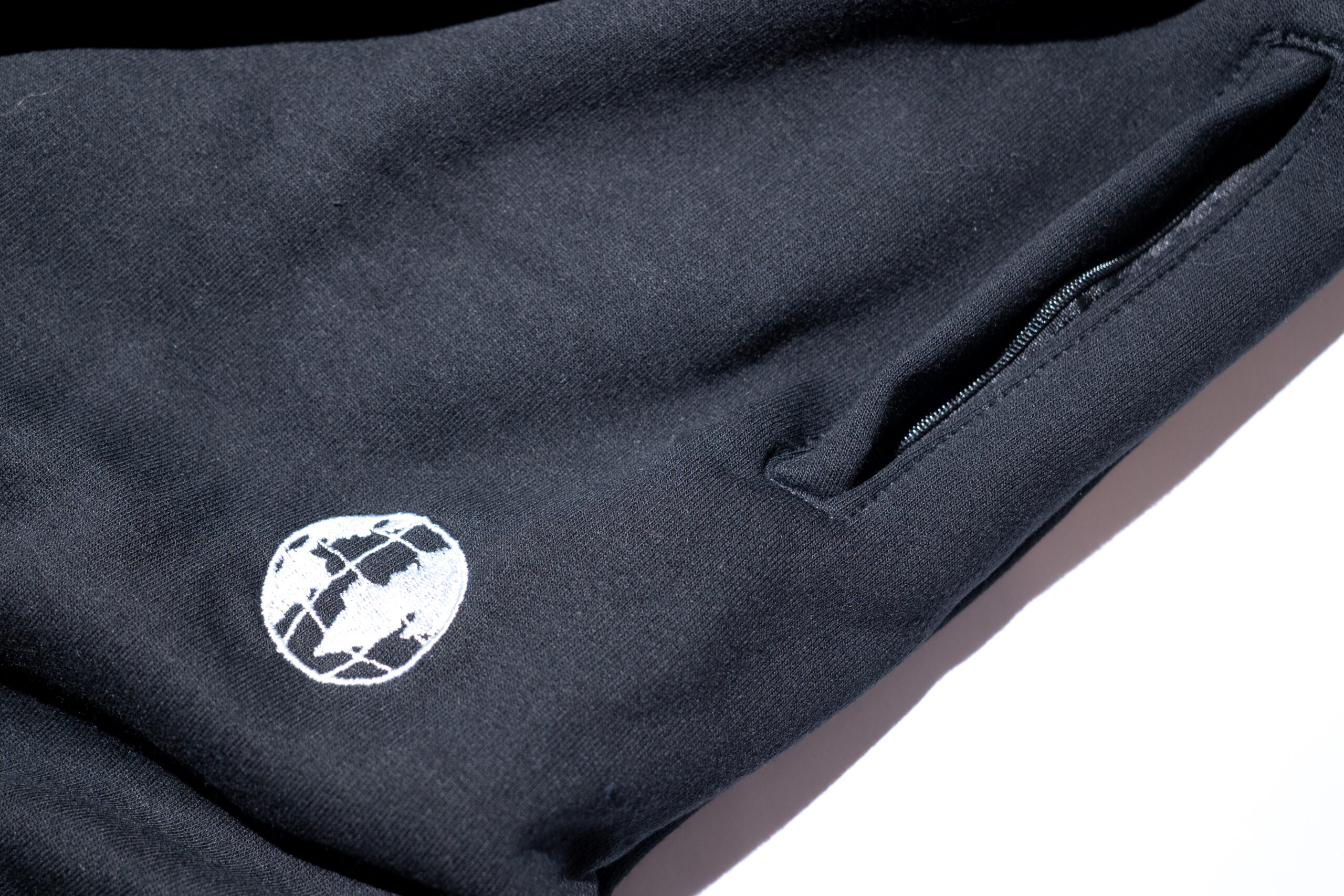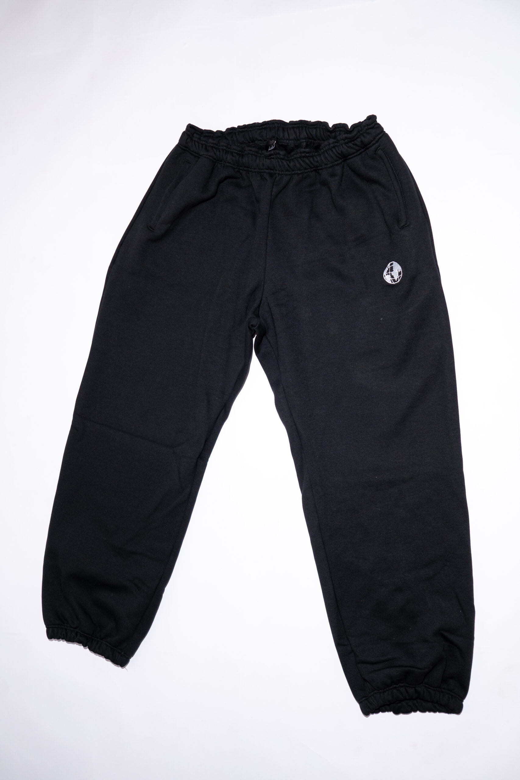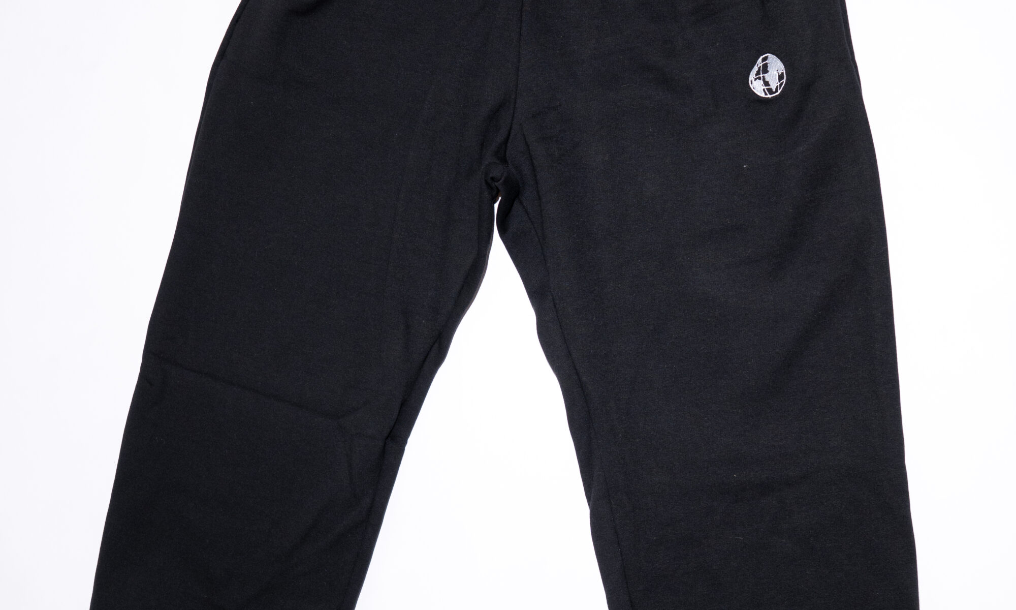 Calça de moletom preta com bordado branco na lateral, cadarço na cintura para ajuste, bolsos com zíper e elástico na barra.